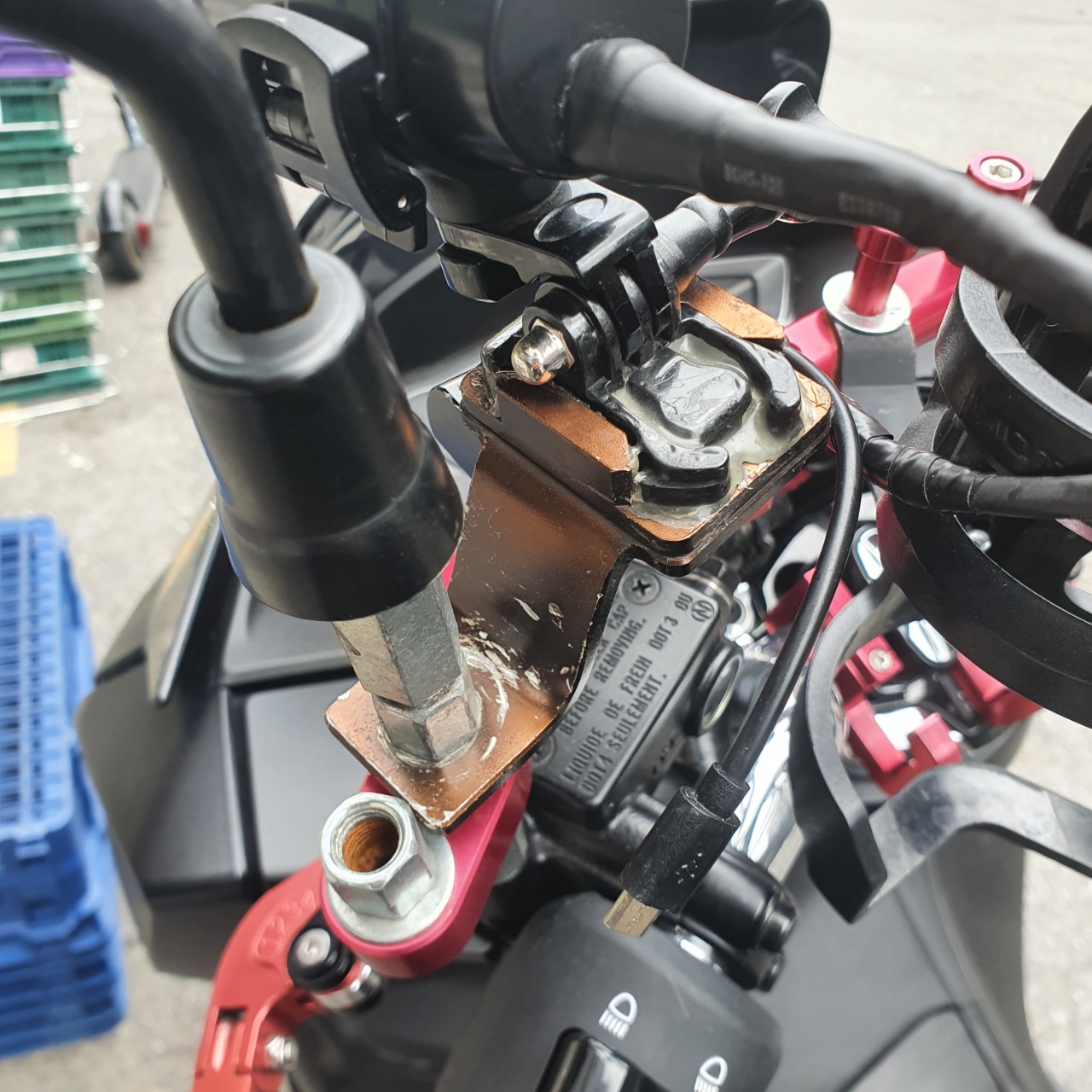 현재 핸들부 세팅인데 멀티바를 설치하고 왼쪽으로는 VF100때 사용하던 ID221 C1이라는 액션캠 겸 블랙박스(=블랙박스기능이 있는 액션캠) 장착되어 있고